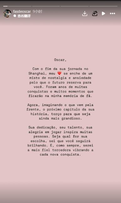 12月20日訊 奧斯卡的國外球迷團體在社媒發(fā)告別信,稱(chēng)奧斯卡在中國的旅途即將結束。